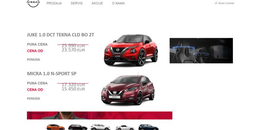 Nissanov diler u Beogradu LF Auto Centar nudi Juke po veoma povoljnoj ceni. Popust iznosi gotovo 6.000 evra. Novi Nissan Juke umesto 25 990 može biti vaš za 23 570 evra. Lista modela na popustu redovno se popunjava. Sniženja su značajna! Možete naravno kupiti i Nissan Micru, sa popustom. Micra 1.0 N-Sport koja košta 17.320 evra može biti vaša za 15.450 evra. Najbolje je da kontaktirate telefonom ili e mailom LF Auto Centar i dobijete ponude za modele koji vas zanimaju.